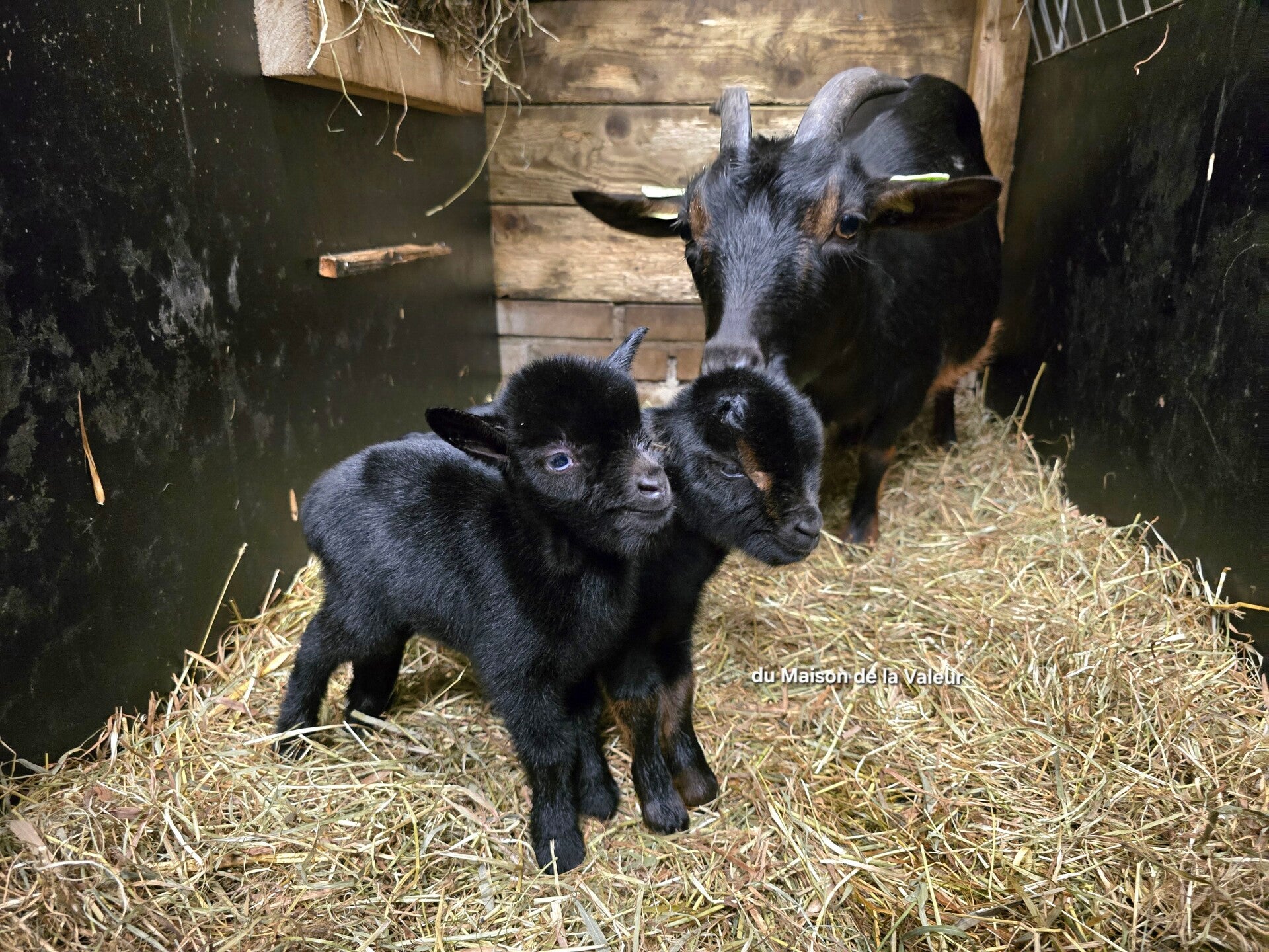 In de avond van 4 maart was alles nog rustig. Nina Chévres et Cochons des gardiens des terres rouges zou elk moment kunnen bevallen, maar maakte nog geen aanstalte. In de nacht die volgde nog wel op de camera gekeken, waarop nog steeds alles rustig leek. Anderhalf uur later schoot ik wakker, ik voelde dat er iets gaande was. Direct weer op de camera gekeken en ja hoor, het eerste lam was al geboren. Snel m'n kleren aan en letterlijk naar de stal gerend. Daar aangekomen was nummer 2 ook al geboren. Zo snel kan het soms dus ook gaan. Het resultaat is een bokje en een mieke. Het mieke is helemaal Zwart met Lelletjes en Blauwe ogen. Het bokje is Black and Tan Brown belly met Blauwe ogen. Odin mag zich trotse vader noemen van deze knappe tweeling. Nina was 151 dagen drachtig.
