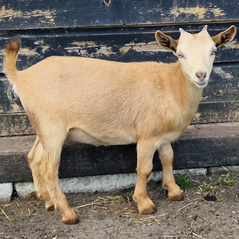 Dit meisje konden wij niet voorbij laten gaan. Zo een mooi egaal Camel mieke met Blauwe ogen. De kleurstelling in combinatie met oogkleur is iets waar we een zwak voor hebben. Toen wij zagen dat zij te koop kwam bij de dwerggeitenstal 'De Tolheuvel', moest het zo zijn. Omdat Felice du Maison de la Valeur het enige Mieke is die we dit jaar aanhouden, is dit mieke Felice haar gezelschap tijdens het spenen. Zij hebben dan elkaar, als ze gedurende 6 weken van de kudde gescheiden zijn.