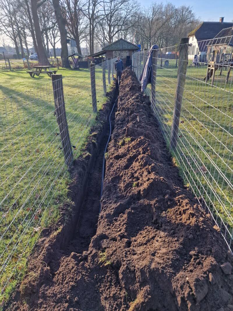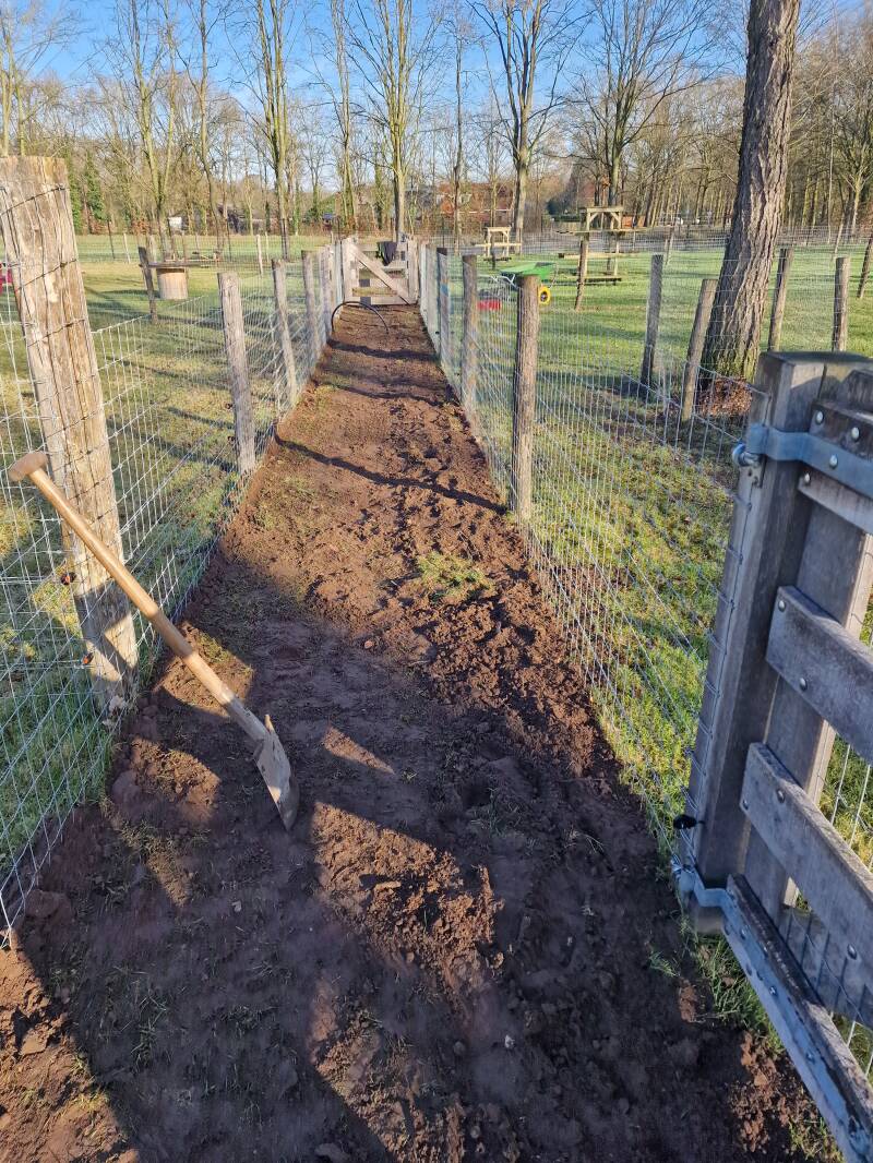 Het was een heuse klus, maar na een dag graven is het ons toch gelukt! De slangen liggen in ieder geval in de grond. We hebben ervoor gekozen om de slangen door het gangpad te laten lopen. Door deze 'gang' kunnen de dwerggeiten vanuit de stal naar de toegewezen weide lopen.