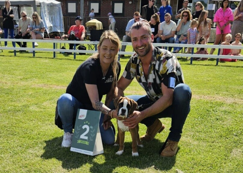 Regina Sorella van Chakrabox is geëindigd op een heel mooie tweede plaats in haar leeftijdsklasse van 3/4 maand. We zijn ongelooflijk trots op haar! Op de foto samen met de fokker Chantal Kramer.